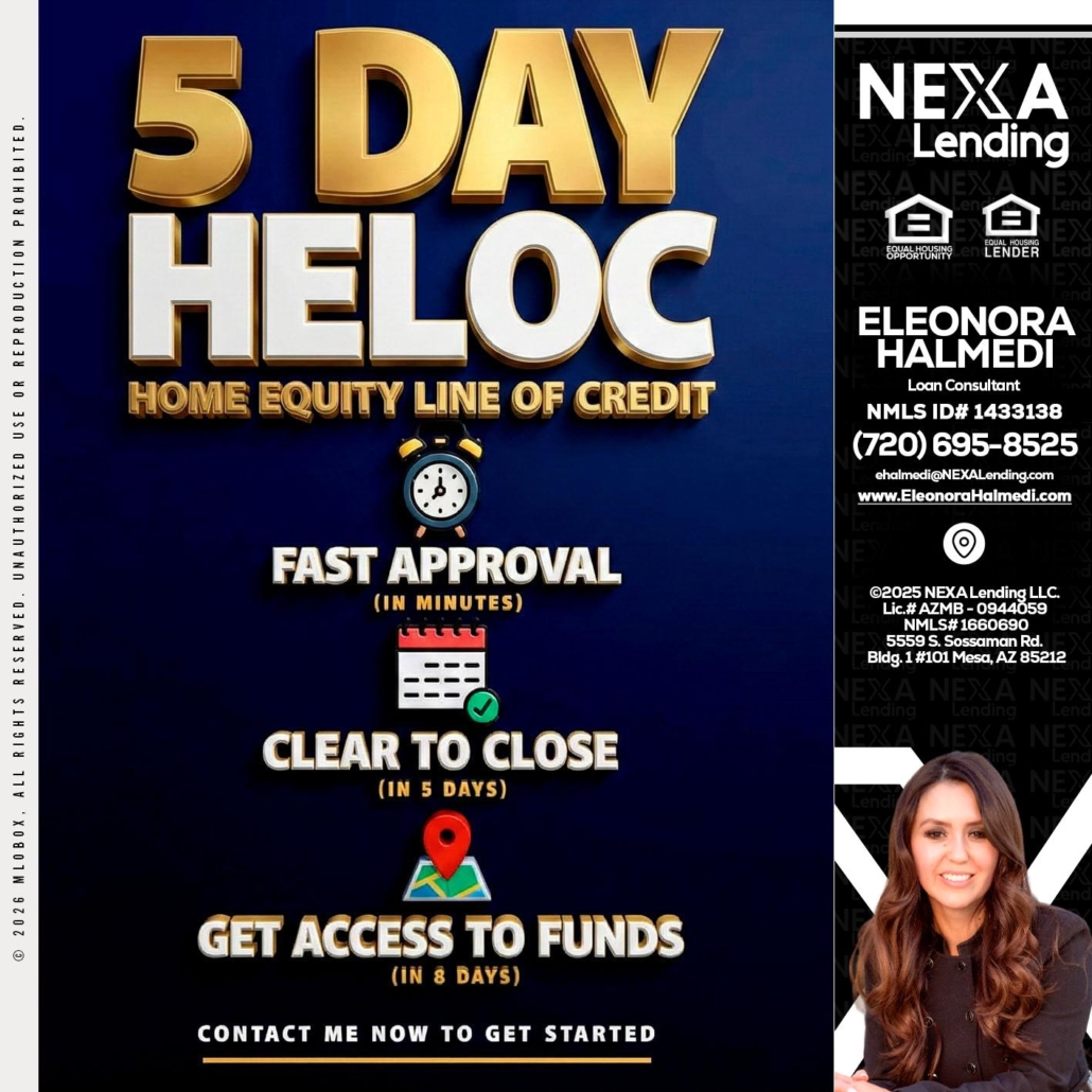 5 day hello - Eleonora Halmedi -Mortgage AdvisorHi, my name is Eleonora Halmedi. I’m a Loan Officer with NEXA Lending LLC., offering personalized mortgage solutions, fast customized quotes, great rates and service with integrity.
