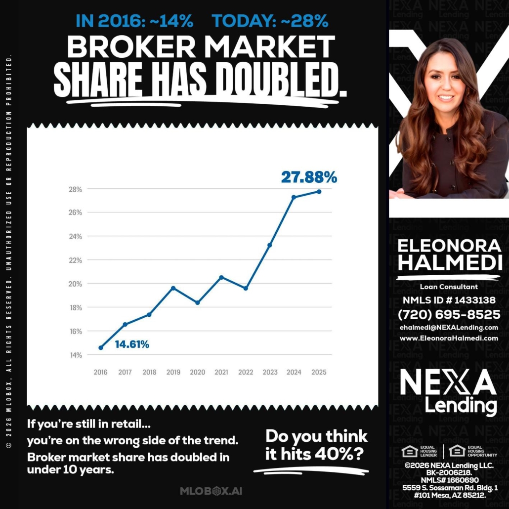 BROKER MARKET - Eleonora Halmedi -Mortgage AdvisorHi, my name is Eleonora Halmedi. I’m a Loan Officer with NEXA Lending LLC., offering personalized mortgage solutions, fast customized quotes, great rates and service with integrity.