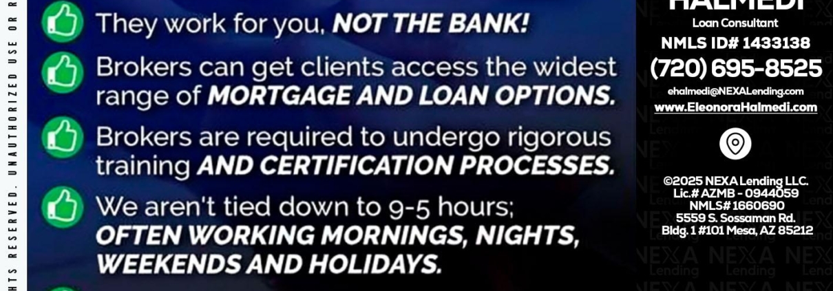 Hi, my name is Eleonora Halmedi. I’m a Loan Officer with NEXA Lending LLC., offering personalized mortgage solutions, fast customized quotes, great rates and service with integrity.
