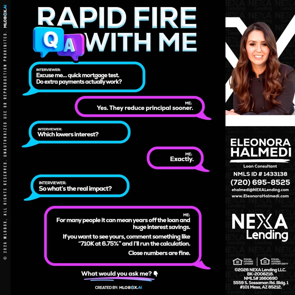 RAPID QA - Eleonora Halmedi -Mortgage AdvisorHi, my name is Eleonora Halmedi. I’m a Loan Officer with NEXA Lending LLC., offering personalized mortgage solutions, fast customized quotes, great rates and service with integrity.