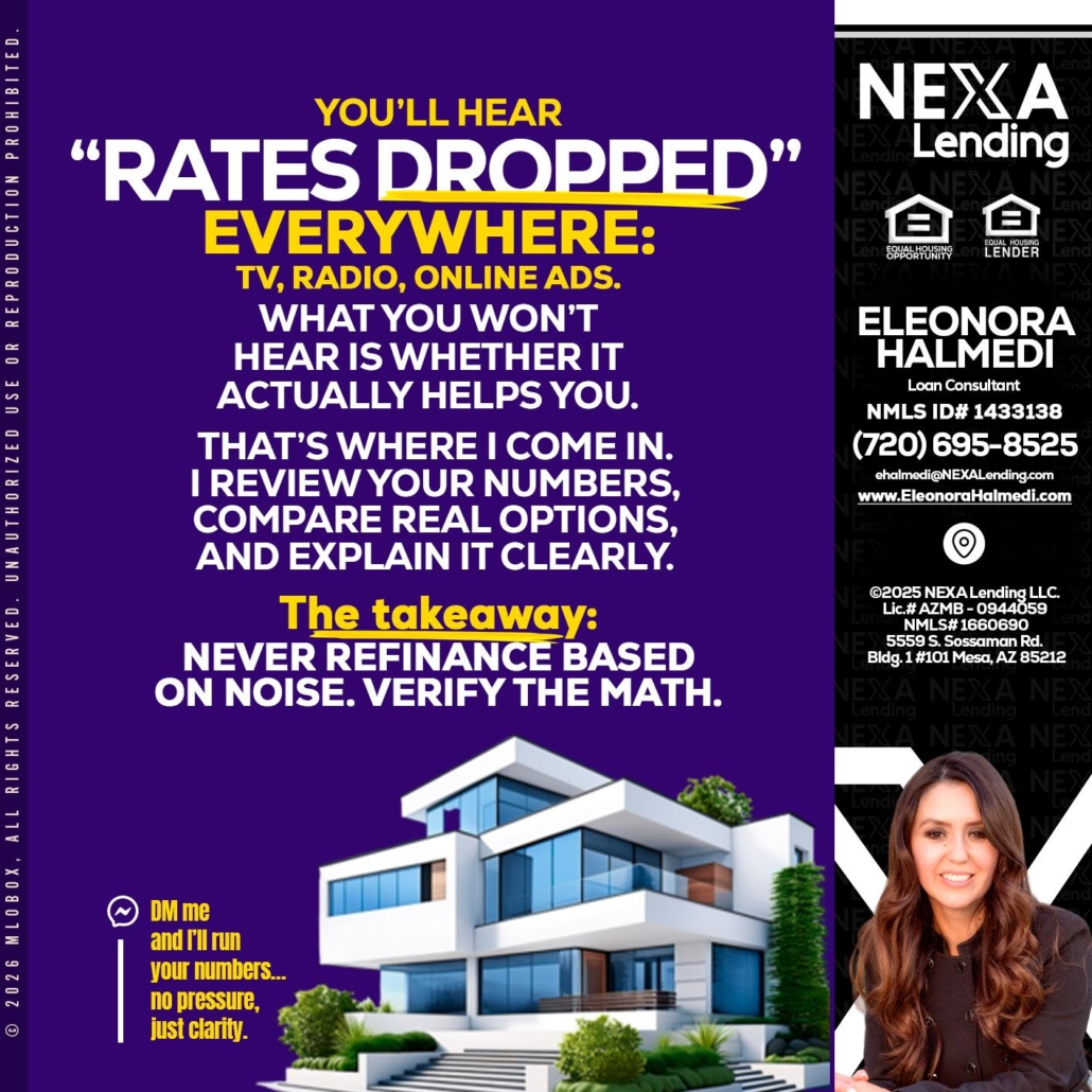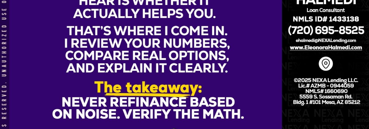 Hi, my name is Eleonora Halmedi. I’m a Loan Officer with NEXA Lending LLC., offering personalized mortgage solutions, fast customized quotes, great rates and service with integrity.