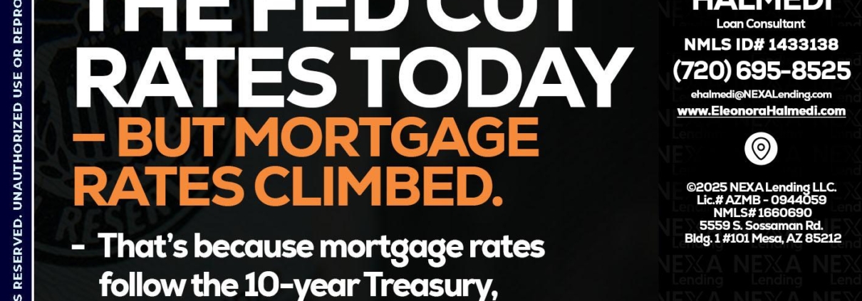 THE FED CUT - Eleonora Halmedi -Mortgage AdvisorHi, my name is Eleonora Halmedi. I’m a Loan Officer with NEXA Mortgage LLC., offering personalized mortgage solutions, fast customized quotes, great rates and service with integrity.