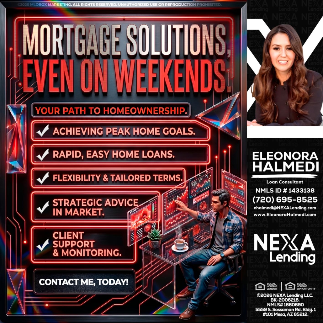 WEEKEND SOLUTIONS - Eleonora Halmedi -Mortgage AdvisorHi, my name is Eleonora Halmedi. I’m a Loan Officer with NEXA Lending LLC., offering personalized mortgage solutions, fast customized quotes, great rates and service with integrity.