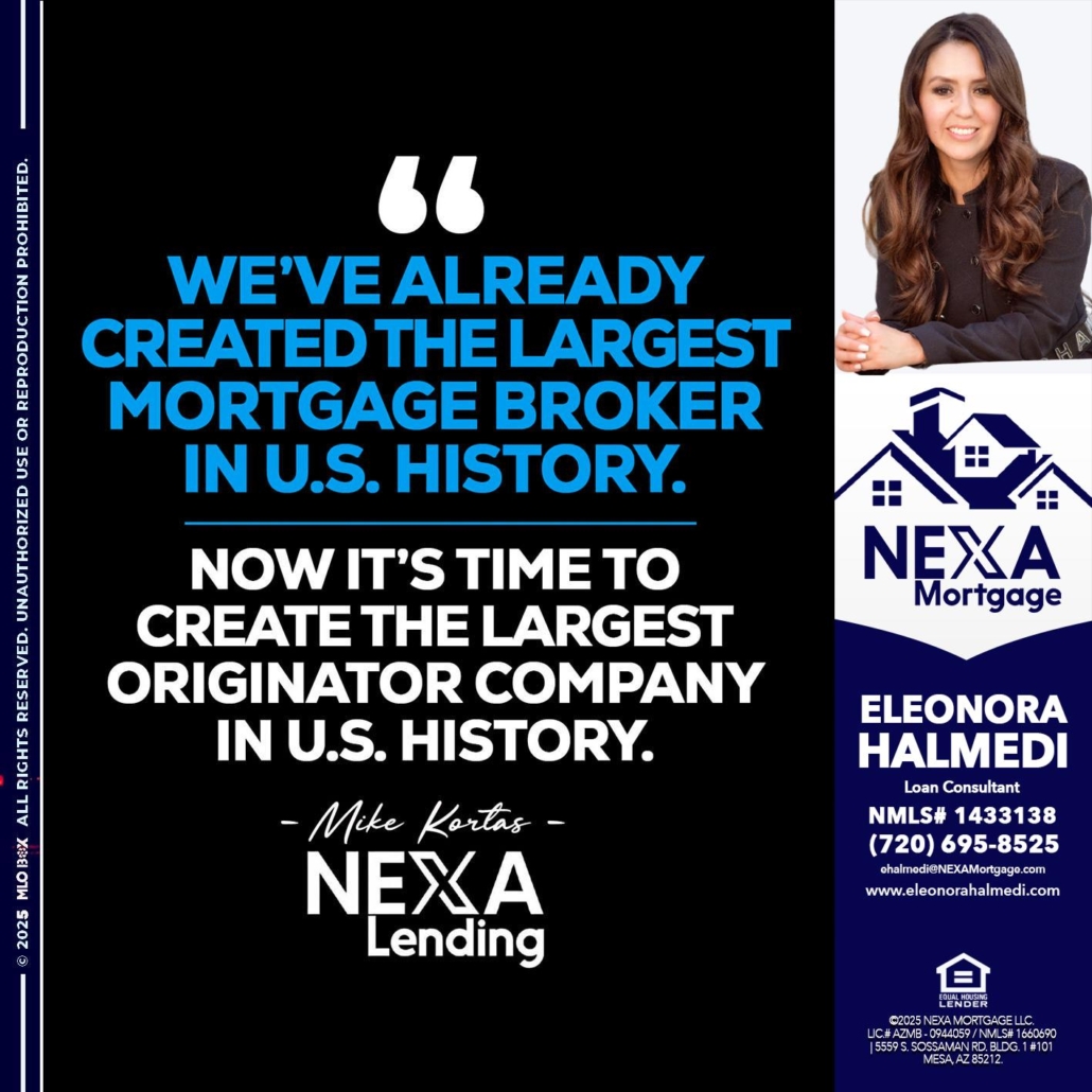 weve already - Eleonora Halmedi -Mortgage AdvisorHi, my name is Eleonora Halmedi. I’m a Loan Officer with NEXA Mortgage LLC., offering personalized mortgage solutions, fast customized quotes, great rates and service with integrity.